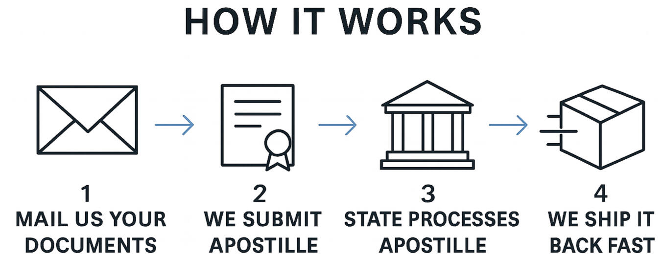 Mail Apostille Request & Documents to SOS Office & wait 4-6 weeks